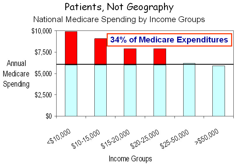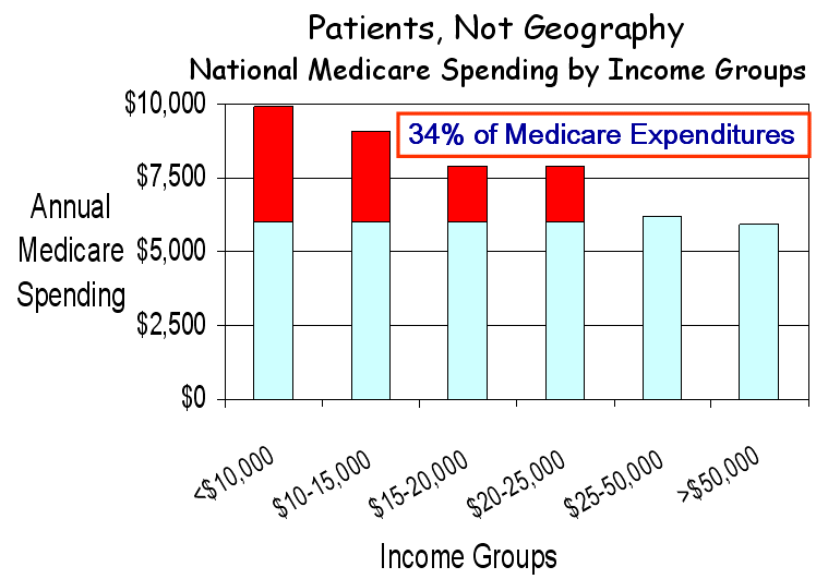 Poverty is a major factor in Medicare spending. In summarizing their remarks, Wennberg and Brownlee state that “a recent study published in the New England Journal of Medicine by some of our colleagues found that poverty and race had virtually no impact on utilization.” What this study actually showed was a strong relationship between poorer health status, greater spending and higher mortality, and it demonstrated a strong relationship between lower income and higher Medicare spending (figure below). In fact, if health care spending for all Medicare beneficiaries were at the same level as for those with annual incomes above $25,000, overall Medicare spending would be 34% less.