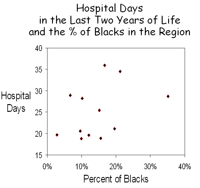 Black is not a measure of poverty. In the obtuse reasoning that characterizes the Dartmouth group, Wennberg and Brownlee’s first argument was that, although blacks utilized approximately 1/3 more care than non-blacks, the amount of care received during the last two years of life was greater in some communities than others for both black and non-black patients, and it didn’t correlate with how many blacks there were (see figure below). They concluded that “race and poverty do affect utilization. Where patients get their care matters far more than the size of their income or the color of their skin.”
