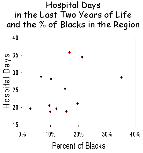 The correlation coefficient of the regression in the other graph (Percent of Blacks vs. Hospital Days) approaches zero (R2 = 0.149). In other words, there is no significant relationship between the percent of the population in a community that is black and the amount of health care utilized. In contrast, the correlation coefficient relating the Percent of Families in Poverty to Hospital Days is extraordinarily strong (R2 = 0.935). Poverty is a very strong determinant of utilization.