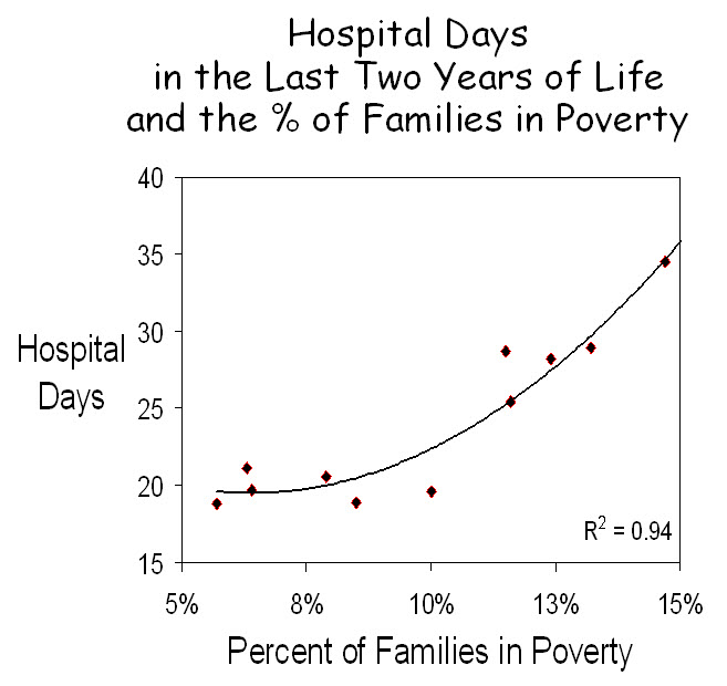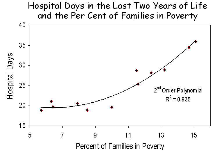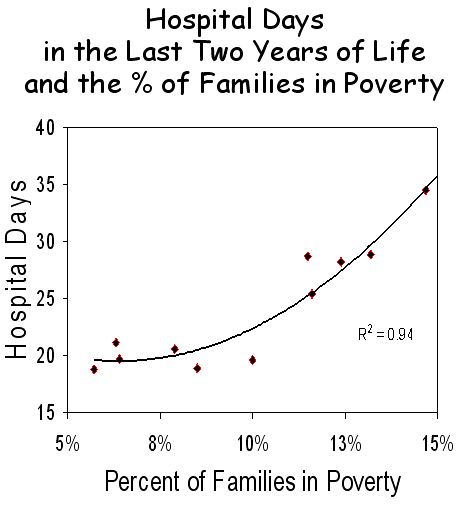 To directly examine income, Census Bureau data on family poverty were obtained for each of the communities Wennberg and Brownlee studied, and these data were plotted against their measures of the number of hospital days used in each community. A very strong correlation was observed (R2 = 0.94), and like previous examinations of the relationship between income and utilization, it best fit a 2nd order polynomial. The answer is clear. Poverty explains a great deal about the differences in health care utilization in various communities.