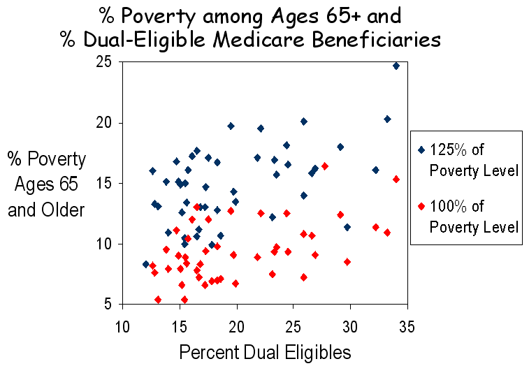 Dual eligibility is not a measure of poverty. Wennberg and Brownlee next assessed the potential role of poverty in a large group of academic medical centers. To do this, they examined the relationship between the number of hospital days used by Medicare beneficiaries during the last six months of life and the percent of patients in each hospital who were dually eligible for both Medicare and Medicaid, assuming that dual eligibility is a valid proxy for poverty. They found no relationship, which led them to conclude that poverty played no role. However, their fundamental assumption was incorrect. Although dual eligibles are poor, dual eligiblility is not a proxy for poverty, as is evident in the figure below.