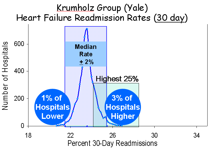 All of the hospitals in the upper 25% as evaluated by MedPAC had readmission rates that were more than 2% above the mean, but that was true for only half of the hospitals as evaluated by CMS and for fewer than 10% of such hospitals as evaluated by the Krumholz group. Indeed, when CMS put its assessment to the statistical test, it found that, despite the wide variation depicted, only 5% of hospitals had readmission rates that were statistically “worse than the US average,” far short of the 25% that would be dunned.