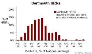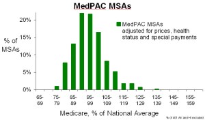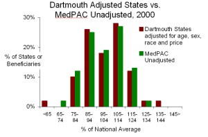 Adjusted variation. Second, as reported by MedPAC and consistent with the above, MedPAC found much less variation in Medicare spending among MSAs after adjusting for prices, health status and special payments than Dartmouth found among HRRs after supposedly adjusting for prices and a host of other factors. The two figures below demonstrate that. One need only look at the broadly dispersed bars in the illustration of Dartmouth variation and the more tightly packed ones in MedPAC’s.