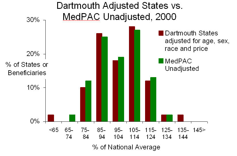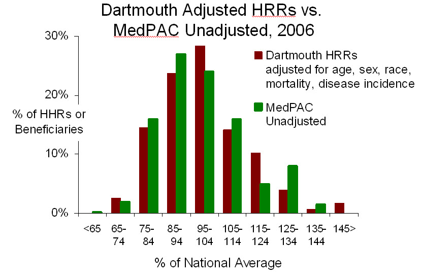 Adjustments. First, the Dartmouth group has claimed that they adjusted their measures of Medicare spending for age, sex, race, mortality, disease incidence and prices. But Dartmouth’s adjusted data are indistinguishable from MedPAC’s unadjusted data, both among states (in 2000) and HRRs (in 2006), as shown to the left. This confirms suspicions that Dartmouth’s “adjustments” are all shadows and mirrors, or just malarkey.