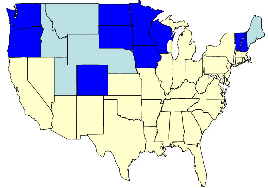 The map shows (in blue) the ten states represented by members of Congress who have publicly endorsed reallocation plans based on geographic differences. Six neighboring states with similar characteristics are lightly shaded. On average, the Medicare spending in these 16 states is 20% less than in the rest of the country.