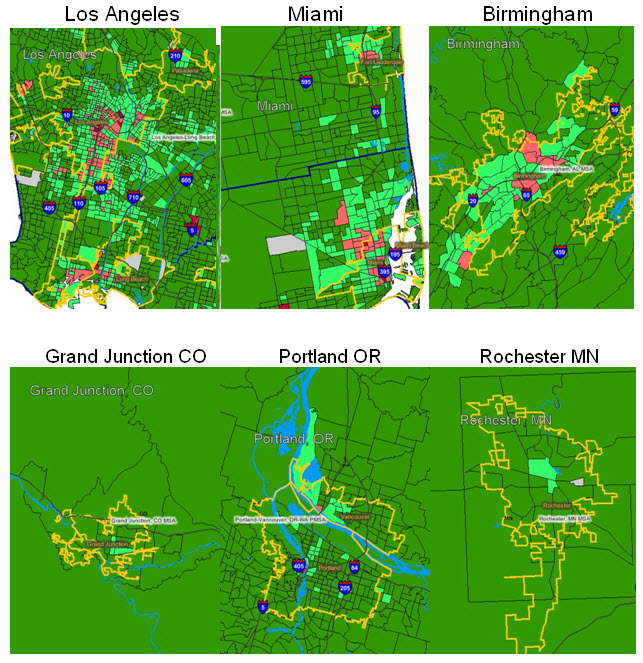 What do Miami, Birmingham and Los Angeles have in common, and what do Rochester MN (home of Mayo), Grand Junction CO, Green Bay WI and Portland OR have in common. One thing is poverty. The maps below show the density of poverty in each (light green shows census tracks with 20-40% poverty and red shows tracks with >40% poverty).Miami, Los Angeles and Birmingham all have poverty ghettos. There certainly is poverty in the other cities, but not in ghettos. The dense poverty ghetto in central Los Angeles includes more than 2 million poor people.