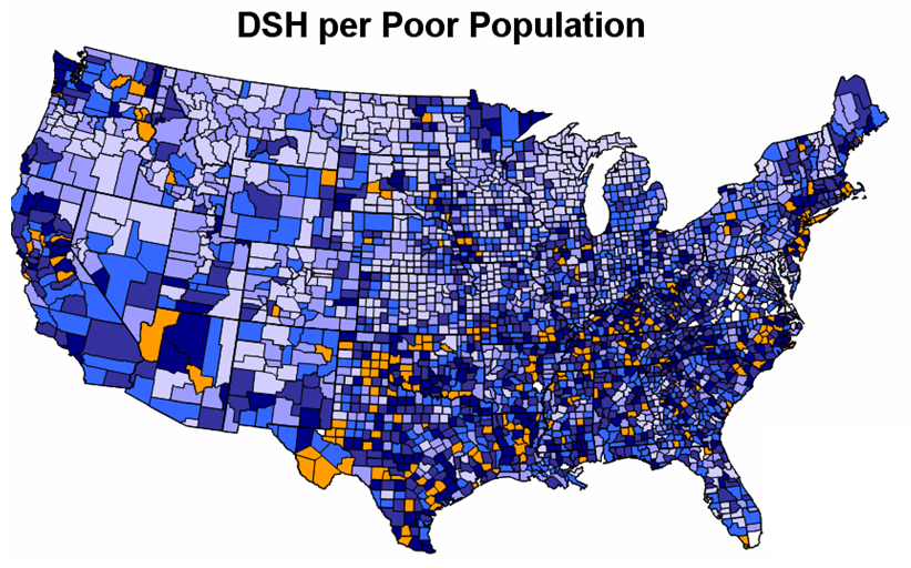 Who would be most hurt? The map below shows the amount of DSH paid by Medicare on behalf of poor patients in the various counties, expressed as DOLLARS per POOR POPULATION (individuals below the poverty level). Note: orange is the most, dark blue is next, pale blue is least. Areas with the densest concentrations of poverty, such as in the south, northeast and California, receive the most, and they will lose the most. The northwest and upper-Midwest win again. Of course, the Dartmouth Atlas tells us that these latter regions are “efficient” and deserve to be rewarded. That’s malarkey! Paying for health care reform on the backs of the poor is poor social policy.