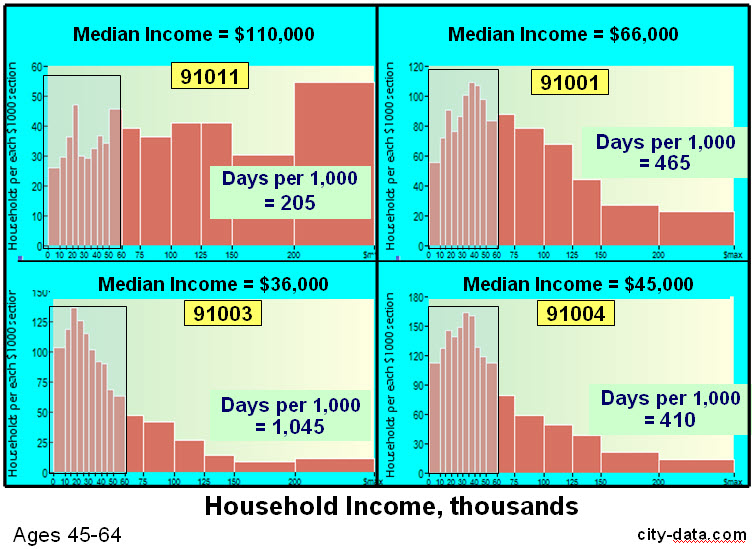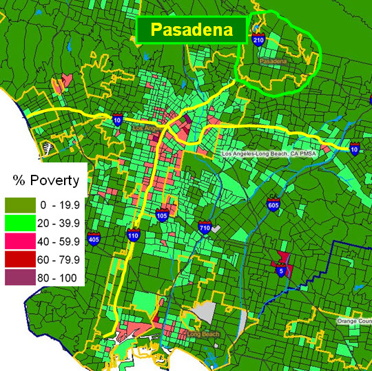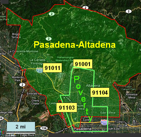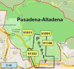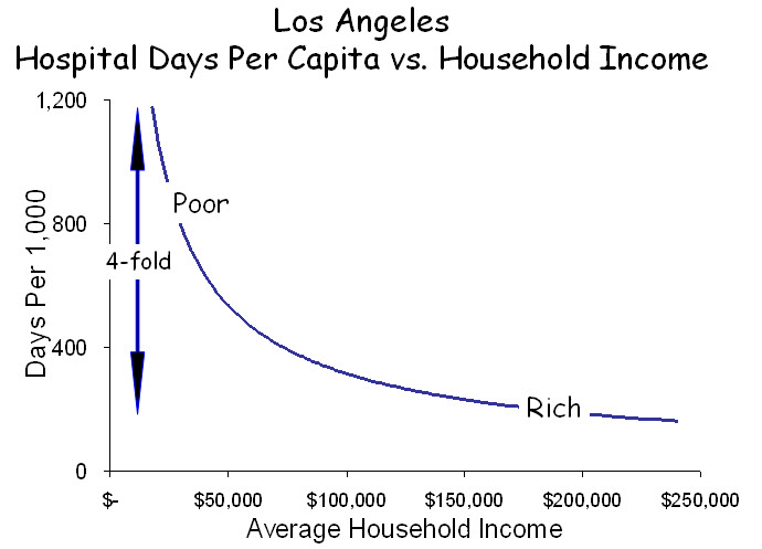 Los Angeles is a case in point. While it possesses a dense poverty core and several affluent zones, it is a patch-quilt of wealth and poverty, often juxtaposed. The Pasadena-Altadena area is one patch in this quilt. A small concentration of poverty overlaps four adjacent ZIP codes, each with more than 20,000 people. In all, this area has 46,000 households with a median income of $60,000, but median incomes among the four ZIP codes range from $36,000 to $110,000, and individual households within them have incomes ranging from $10,000 to more than $1.0M. The utilization of hospital care also ranges widely among these ZIP codes, from 205 days per 1,000 in the wealthiest to 1,045 per 1,000 in the poorest.