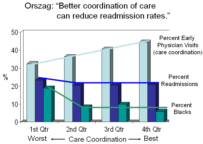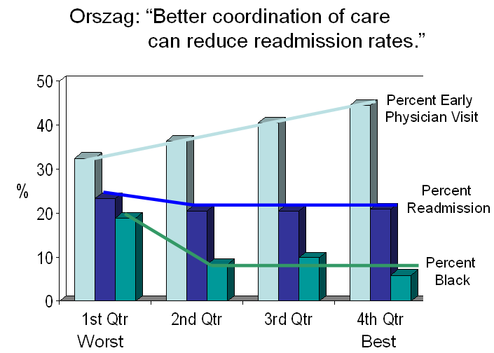 On the 71st anniversary of “The Wizard of Oz,” Peter Orszag, the wizard of health care reform, returned to the pages of the NEJM, this time to tell the wonderfulness of his Affordable Care Act. One of its great features is that it will penalize hospitals with excessive readmission rates, easily avoidable by simply assuring that patients have a physician visit quickly upon discharge since, according to a paper that he quotes from a recent JAMA, early follow-up reduces readmissions. So I read the paper and summarized it in the bar graph below. What it shows is that there is no difference in readmissions among hospitals in the three highest quartiles of follow-up visits, despite a substantial decline in follow-up among them. Only the lowest quartile of hospitals has more readmissions. Also, there’s no difference in the percent of blacks at the hospitals in the three highest quartiles for follow-up. Only the lowest quartile has more blacks – by double. So there’s no gradient that links follow-up to readmissions, but there is a distinctive quality about the hospitals with more readmisions – more blacks, which really means more poverty. Follow the yellow brick road. It leads to poverty. Penalizing hospitals that take care of the poor and therefore have more readmissions certainly will not help.