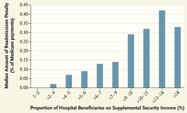 ***********************************************************************The figure that follows, which was taken by a recent paper in the NEJM by Joynt and Jha, shows how the readmission penalties that resulted from the ACA disproportionately harm hospitals that care for patients receiving Social Security Disability. Yes, utilization is greater and readmissions are more frequent among patients who are sicker and poorer.
